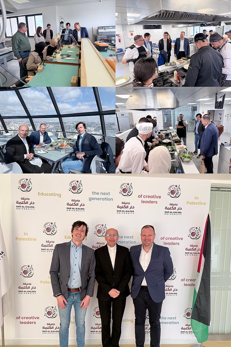 Seit vielen Jahren wird eine dynamische Partnerschaft zwischen Dar al-Kalima und dem Land Baden-Württemberg gepflegt, hierbei sind insbesondere die Bereiche Schmuckdesign und Kochkunst hervorzuheben. Zur Vertiefung und zum Ausbau der Zusammenarbeit im Bereich der Dualen Bildung war heute die Leitung des Referats „Internationale Kooperationsprojekte“ des ZSL Baden-Württemberg an der Dar al-Kalima Universität zu Gast. Die Gäste waren tief beeindruckt von der Gestaltung der Lehrküche, ein umfangreiches Projekt, zu dessen Verwirklichung das Land Baden-Württemberg einen entscheidenden – auch finanziellen – Beitrag geleistet hat. Absolut begeistert waren sie natürlich vom Show-Cooking und den leckeren Speisen, die sie genießen durften.